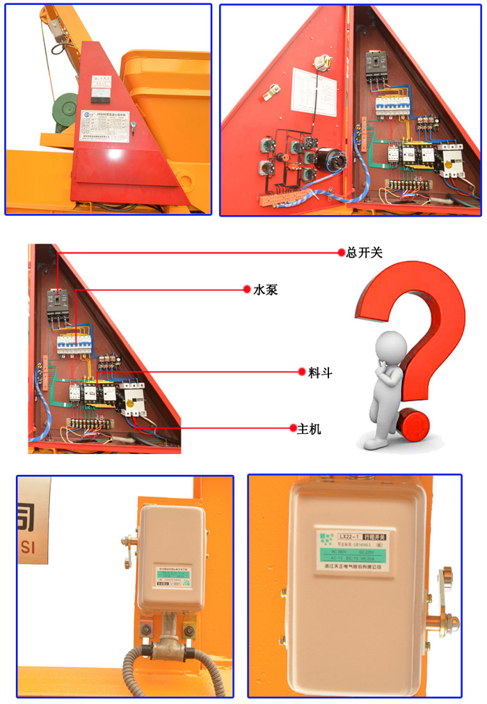 JS500攪拌機(jī)電控系統(tǒng)有空氣開(kāi)關(guān)、熔斷器、熱繼電器,有短路保護(hù)、過(guò)載保護(hù)的功能。所有控制按鈕及空氣開(kāi)關(guān)手柄和指示燈均在配電箱門(mén)上,并設(shè)有門(mén)鎖。按鈕上有防護(hù)罩。配電箱內(nèi)的電器元件裝在一塊緣板上,安全可靠,操作維修方便。